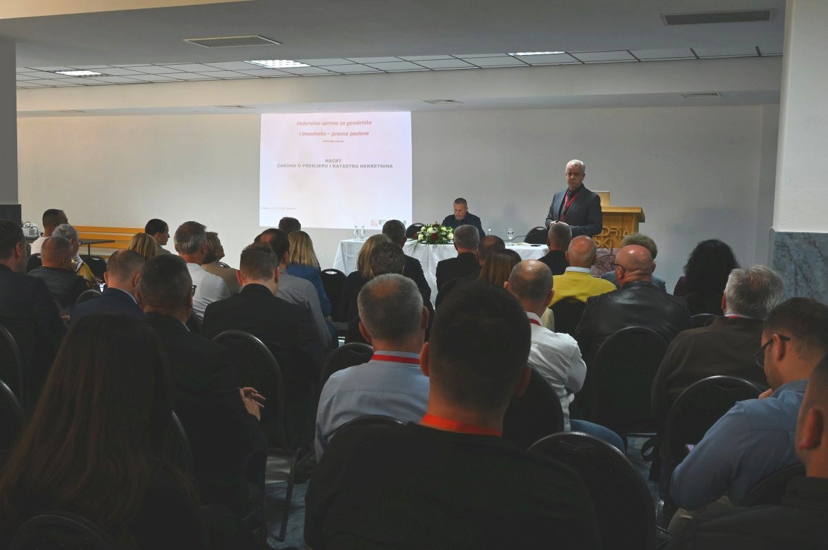 Uslijedila je prezentacija ravnatelja FGU Željka Obradovića u kojoj su sudionici Skupštine upoznati s aktualnostima u radu Federalne uprave za geodetske i imovinsko-pravne poslove (FGU). Kolega Obradović posebno je istaknuo i sudionike upoznao s početkom realizacije GIVE projekta (Projekt unapređenja geoprostorne infrastrukture i procjene vrijednosti), kojim se nastavljaju i na višu razinu dižu aktivnosti provedene kroz projekt „Registracija nekretnina“.